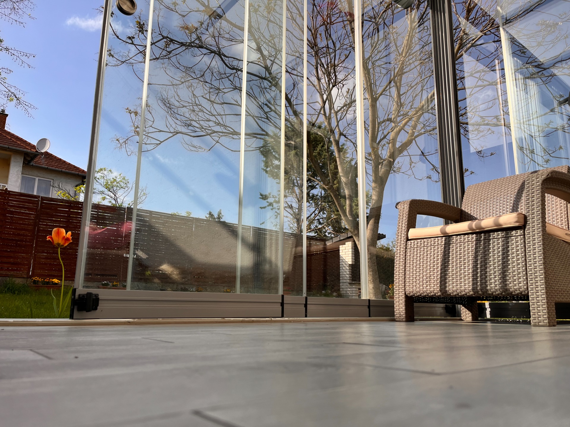 2 éve készült télikert, kültéri járólap burkolattal, minden oldalon elhúzható üvegajtókkal és üveg tetővel, felette kihúzható árnyékolóval, amire nyáron a délutáni órákban van szükség.